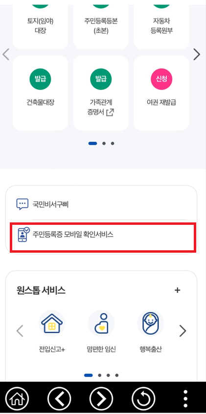 정부24앱에서 스크롤을 내리면 주민등록증 모바일 확인서비스 클릭