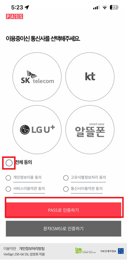 모바일신분증은 반드시 본인인증을 해야 하는데요. 먼저 통신사를 선택한 후 전체 동의를 누르신후 pass or 문자(sms)로인증하기중 선택하여 인증하시면 됩니다.