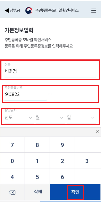 이름, 주민번호, 주민등록증 발급일자를 모두 입력후 확인버튼 눌러주세요.