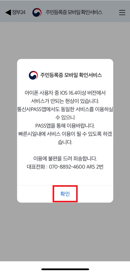 주민등록증 확인서비스를 등록하시겠냐는 메세지가 나오면 확인버튼을 눌러줍니다.